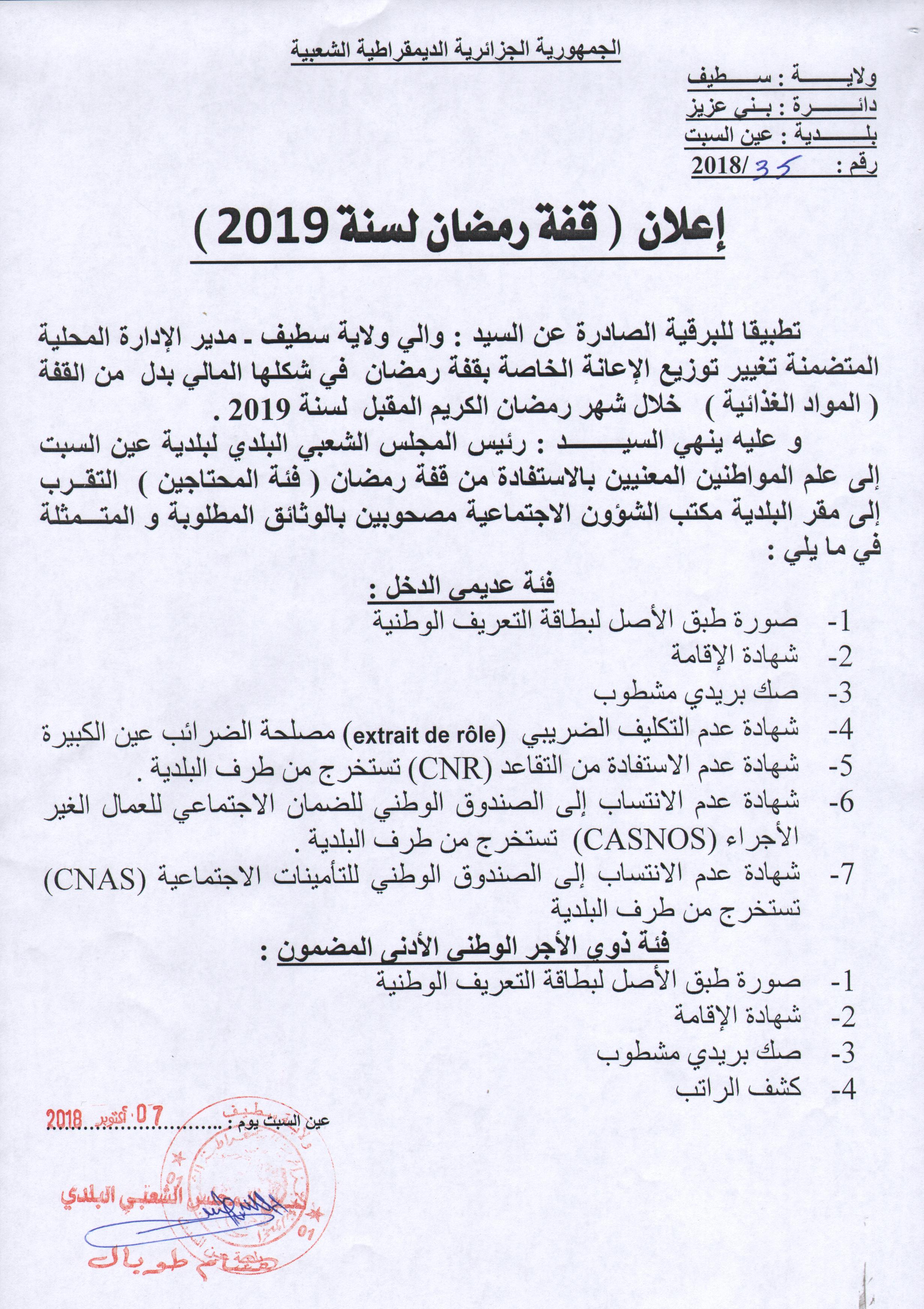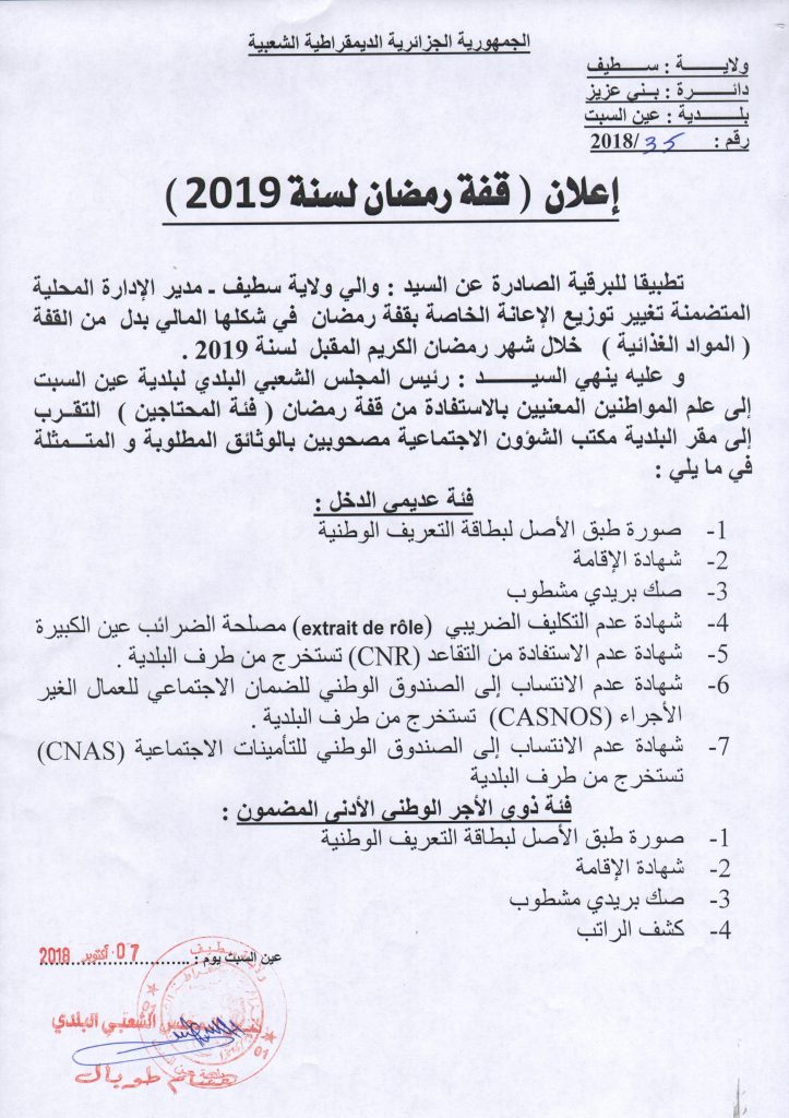 إعلان بخصوص قفة رمضان لسنة 2019 الأحد 27 محرم 1440هـ 7-10-2018م إعلانات, إعلانات مختلفة شاركها Facebook Twitter Google + Stumbleupon LinkedIn