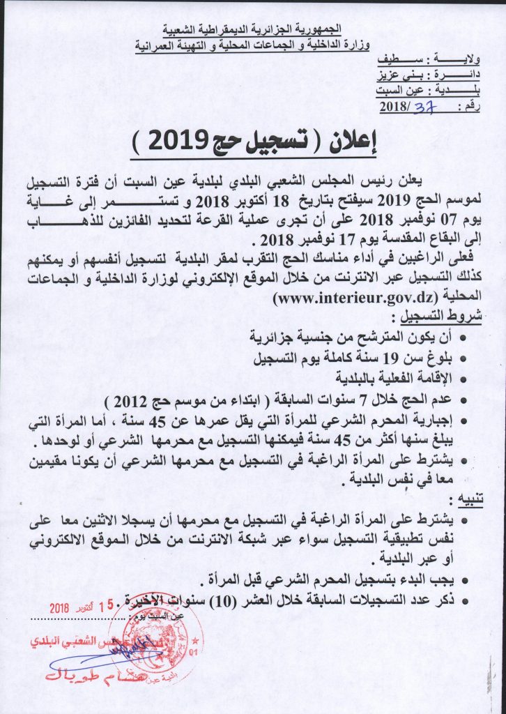 تمديد آجال التسجيل في عملية القرعة لموسمي الحج🕋 2020 و 2021 إلى غاية يوم السبت 01 …