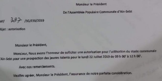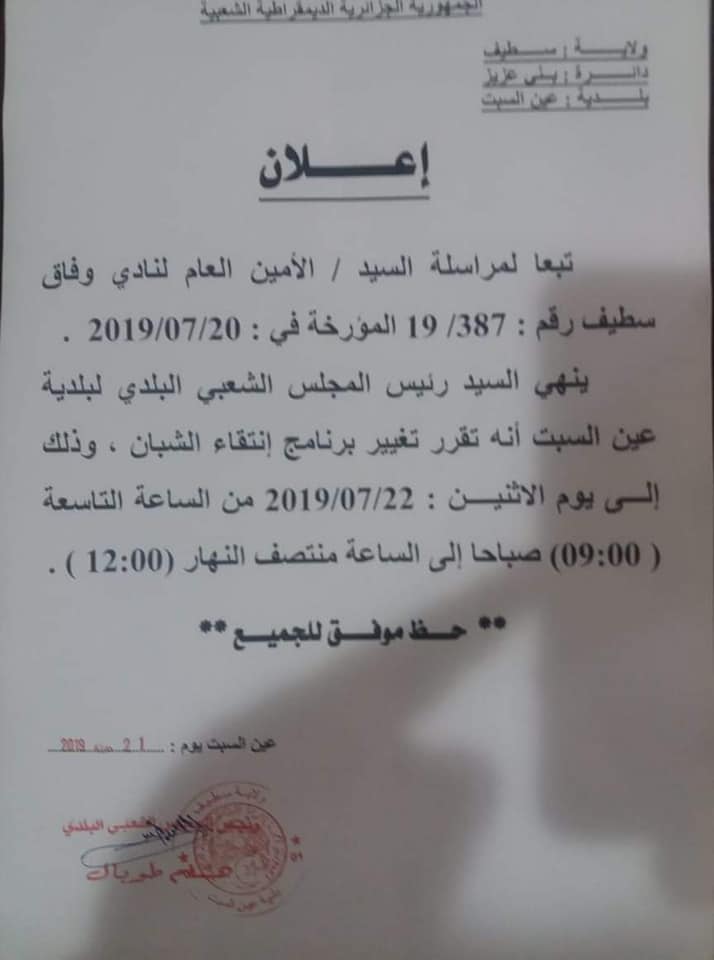 تبعا لمراسلة السيد الامين العام لنادي وفاق سطيف ، برنامج إنتقاء المواهب الشابة لوفاق سطيف لبلديات دوائر بني عزيز بابور و جميلة تقرر أن يكون بحول الله يوم غد الاثنين 22 جويلية 2019 بالملعب البلدي لبلدية عين السبت ابتداء من الساعة التاسعة صباحا الى منتصف النهار …