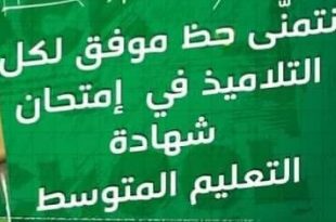 بتوفيق من الله عز وجل يقوم اليوم الأحد 9 جوان 2019 و إلى غاية يوم الثلاثاء ، تلاميذنا الأعزاء و المقدر عددهم ب 220 تلميذ ، باجتياز الامتحان لنيل شهادة التعليم المتوسط في ظروف يسودها الجد والتركيز على مستوى مركز الاجراء بمتوسطة الطيب العقبي عين السبت ، و لقد سخرت …